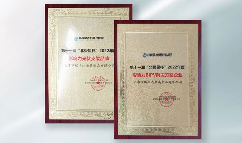 天津市瑞丰达金属制品有限公司如约参加本次庆典,公司凭借优秀的产品质量以及一流的服务品质荣获“北极星杯”2022年度影响力光伏支架品牌和“北极星杯”2022年度影响力BIPV解决方案企业两项大奖。本次奖项获得,表明了瑞丰达拥有过硬的产品质量以及良好的业界口碑,同时也肯定了瑞丰达作为一家新能源企业,“始终致力于发展光伏发电新能源领域,为发展绿色社会做出贡献”的企业愿景。