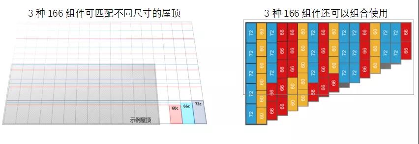 从铺满屋顶最大化安装容量的角度,三种尺寸的166组件可以满足不同应用场景的需求;此外由于工作电流一致,三种166组件还可以组合使用,进一步提高屋顶的利用率,详见下图。