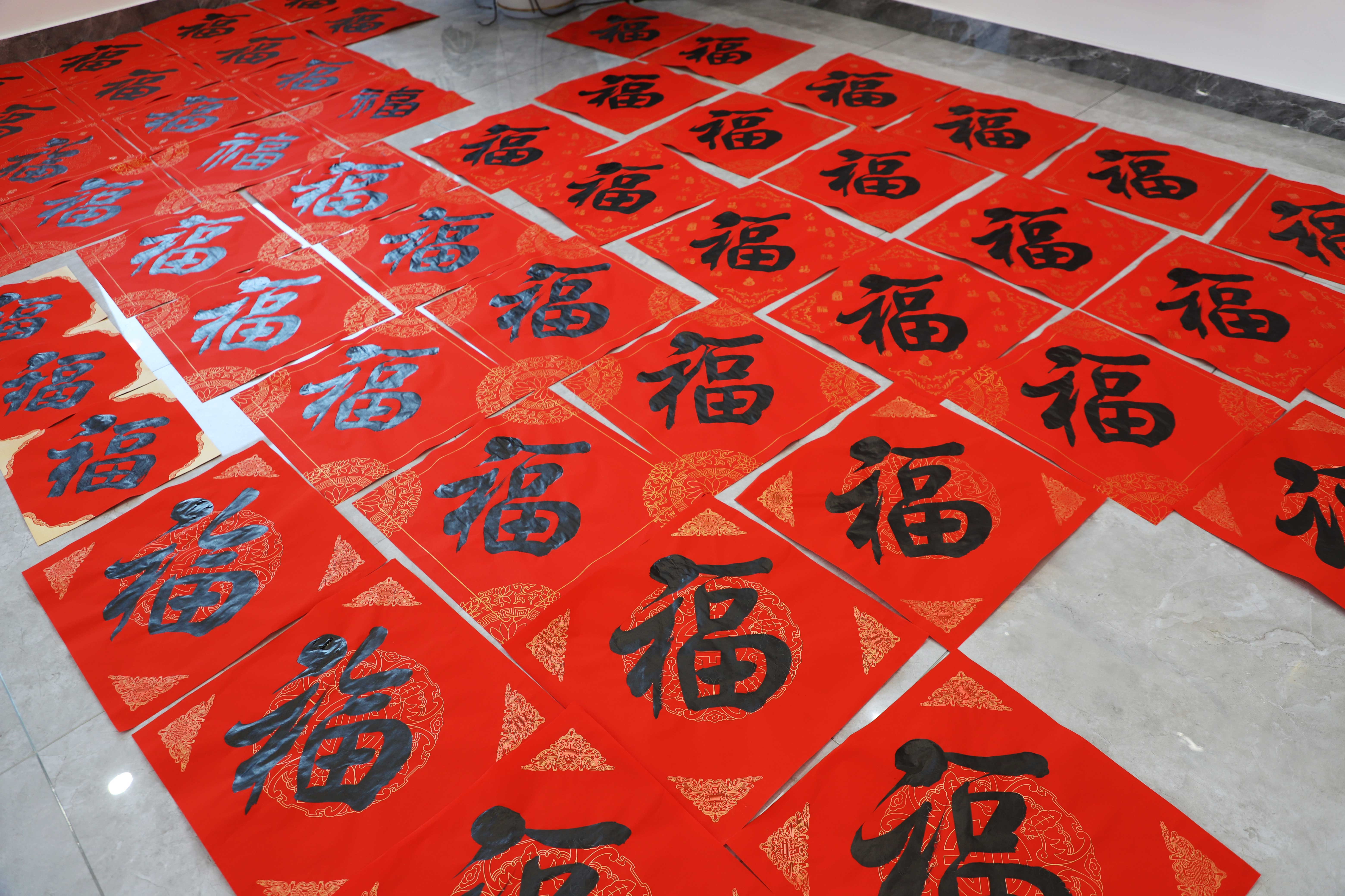 王总将笔墨纸砚,正方形红色彩纸摆放于桌面。她蘸墨、起笔、运腕,横竖撇捺之间,“福”字跃然纸上。
