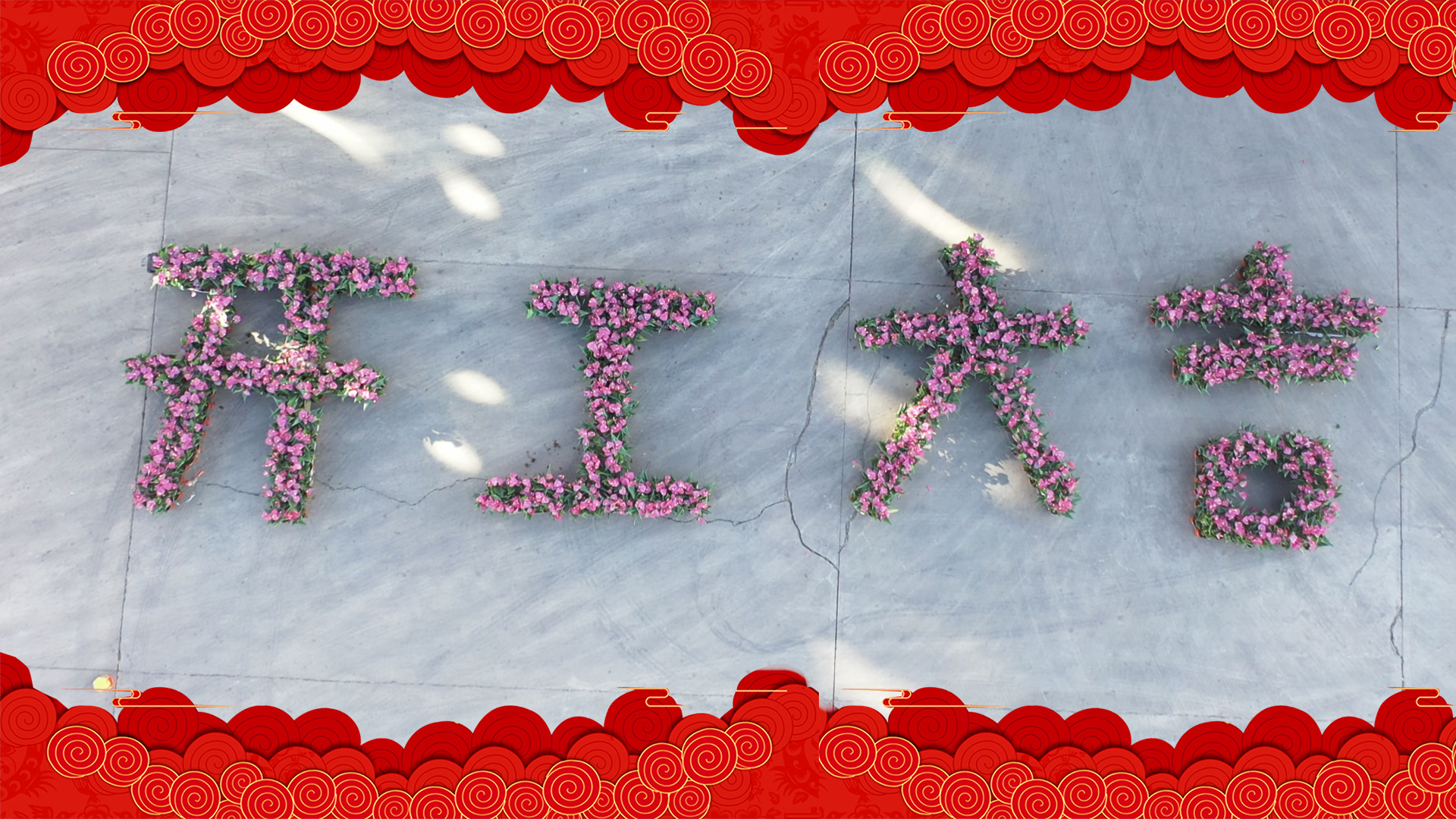 用鲜花摆成“开工大吉”四个字,寓意新的一年事业顺利、蒸蒸日上,鲜花的生机与芬芳象征着公司充满活力,