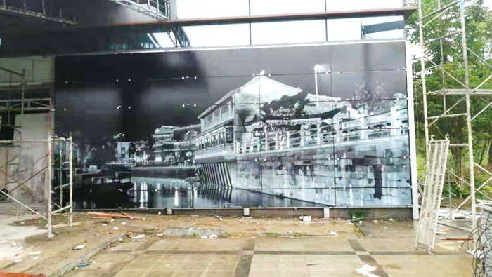 全球第一幅光伏壁画,通过特殊的加工,将稻河美景用木刻版画的风格展现出来。