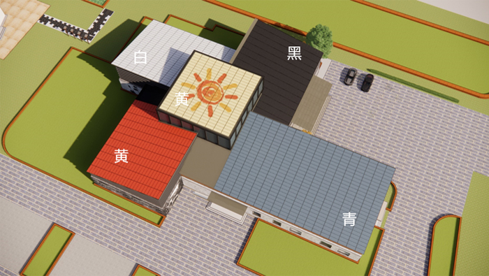 展览馆的展厅屋顶由彩色太阳能组件构成,根据社稷的造型分为东 西南北中,用五种颜色,青白红黑黄,寓意五谷丰登、国泰民安。