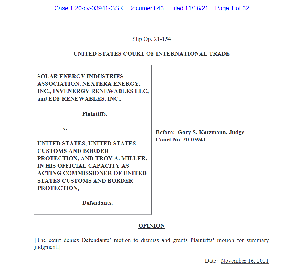 “美国国际贸易法院下调201条关税率,并恢复双面组件关税豁免权的决定显然是正确的,这两项决定严厉打击了201条关税支持者的非法企图。”