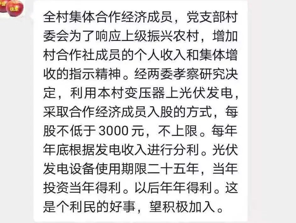 最近,有朋友发了一张图,说他们村开始通知村民集资建光伏电站了,然后年底进行分红。一时间来,老百姓的投资意识又提高了,开始集资建光伏电站了。