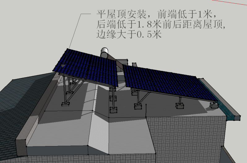 坡屋顶部分加装太阳能光伏系统,原则上贴现有坡屋顶结构架设且不得超出屋顶范围。平屋面加装太阳能光伏系统,直接架设在平屋顶上,且低端距屋面高度小于1.0米、高端距屋面高度小于1.8米、与平屋顶边缘(女儿墙)距离大于0.5米。