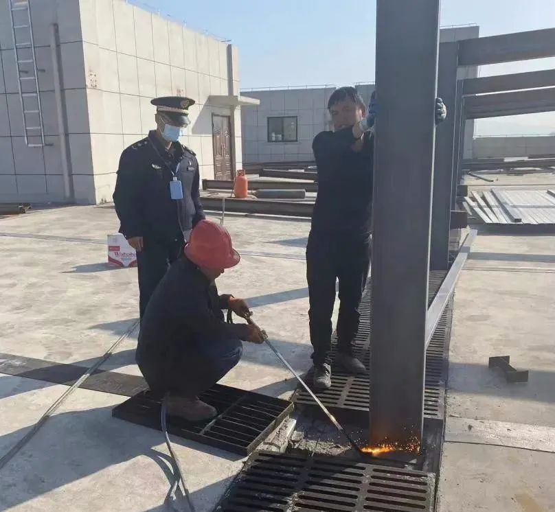 原来该企业正在厂房楼顶建设光伏系统,光伏支架已基本搭建完成,然而,该支架最高端高度近3米,最低端高度也有2.2米,明显不符合光伏组建设置标准。执法人员当场责令该企业停止施工,并就“光伏建设相关要点指南”进行宣传讲解,指导企业主规范设置光伏系统,并督促整改。因其逾期不整改,苏溪大队组织人员对光伏支架进行拆除。